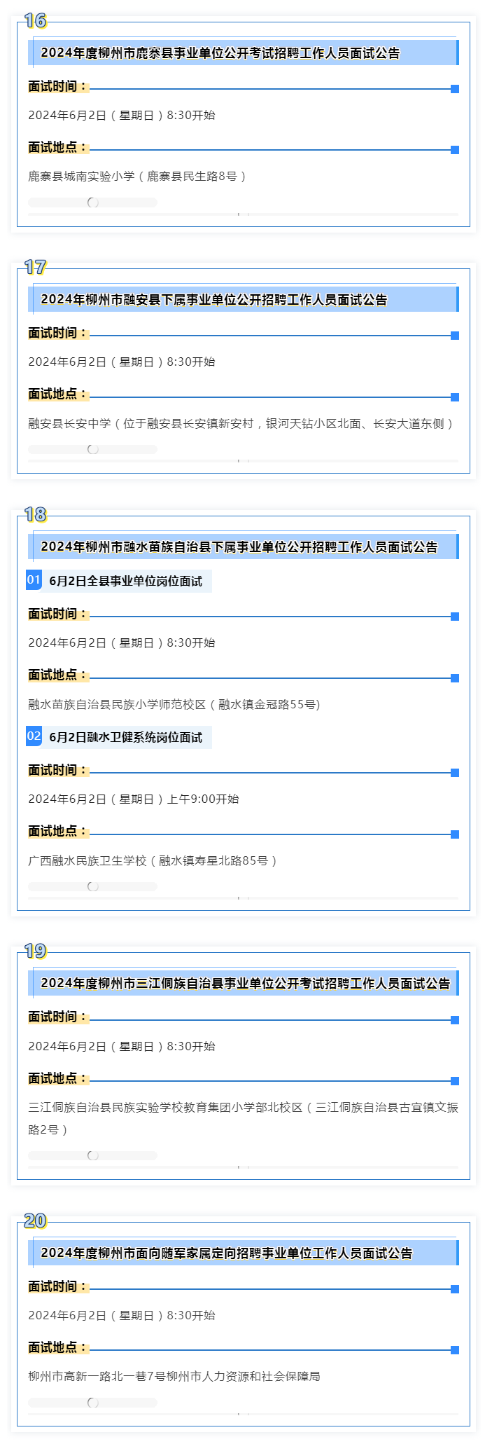 請考生根據(jù)自己報考的崗位,在廣西柳州市人力資源和社會保障局官網(wǎng)的“事業(yè)單位招聘—面試公告”專欄(網(wǎng)址:http://rsj.liuzhou.gov.cn/ztzl/rsywbm/lzsrcfwhrspxkszx/sydwzp/msgg/),查看崗位對應(yīng)招聘單位(主管部門)的面試公告。