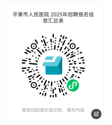 1.填寫(xiě)提交紙質(zhì)版《平果市人民醫(yī)院2025年度公開(kāi)招聘專(zhuān)業(yè)技術(shù)人員報(bào)名表》(附件3),并掃描下方二維碼填寫(xiě)報(bào)名信息。