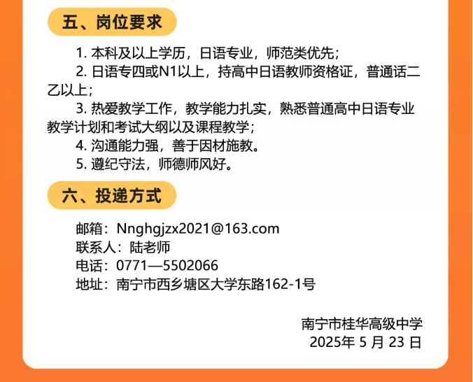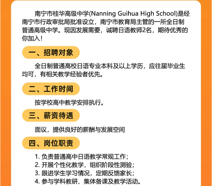 2025年廣西南寧市桂華高級中學面向社會公開招聘日語老師2人