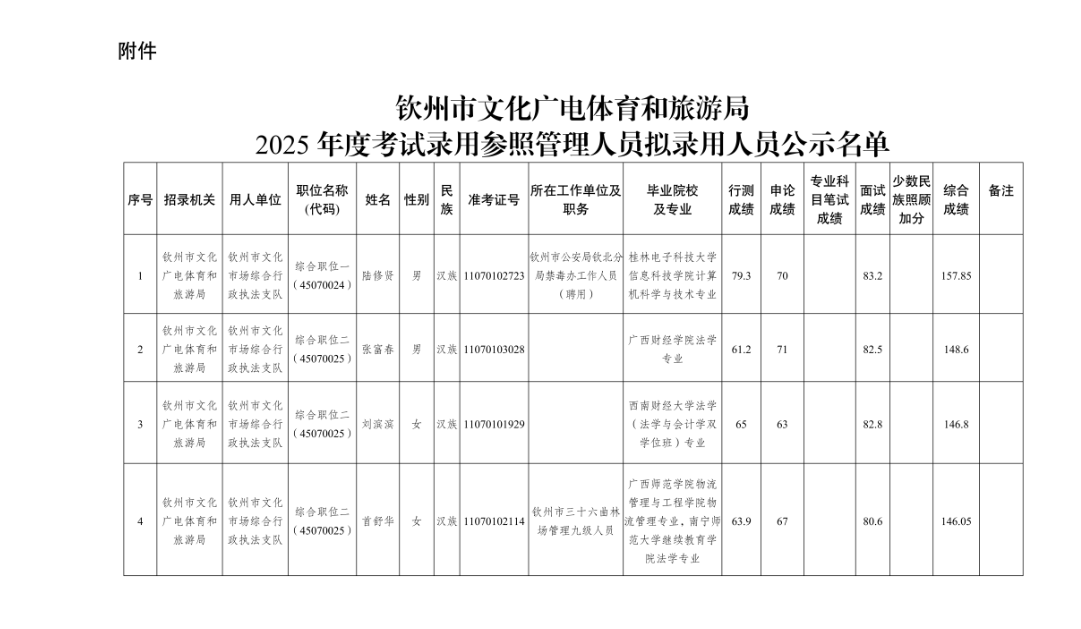 根據(jù)《廣西壯族自治區(qū)2025年度考試錄用公務(wù)員公告》等有關(guān)規(guī)定,我單位2025年計劃招錄4名參照管理人員,經(jīng)過公開報名、資格審查、筆試、面試、體檢、考察等程序,擬錄用陸修賢等4位同志(附件)為參照管理人員,現(xiàn)予以公示。公示期5個工作日,如對擬錄用人員的錄用資格有異議,請在公示期內(nèi)向欽州市文化廣電體育和旅游局人事科實名反映。