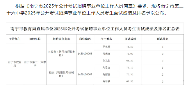 南寧市教育局關(guān)于公布南寧市第三十六中學2025年公開考試招聘事業(yè)單位工作人員考生面試成績及排名的公告