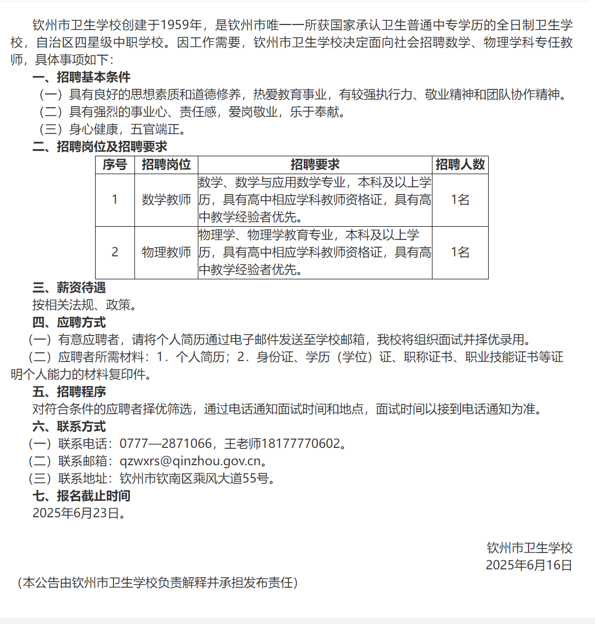 欽州市衛(wèi)生學校2025年公開招聘數學、物理學科專任教師公告