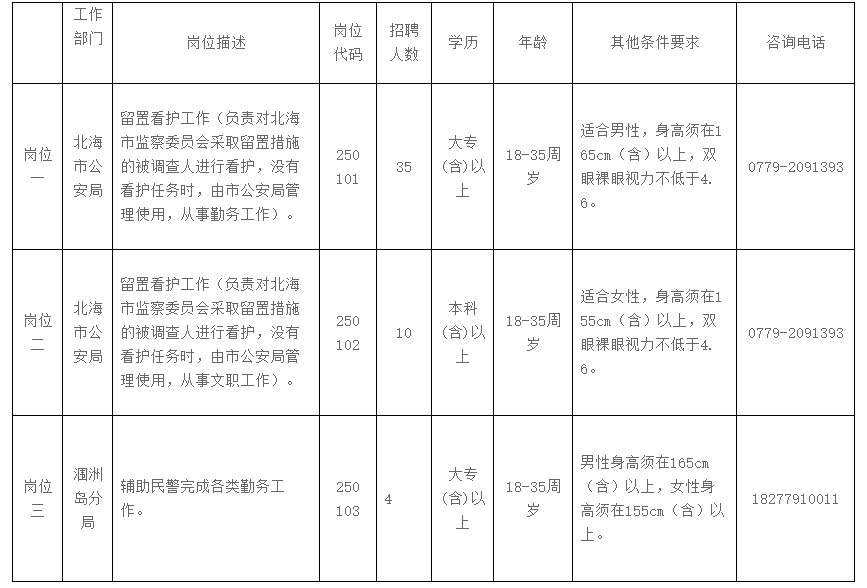 有關(guān)招聘信息,應(yīng)聘人員可登錄北海市人才網(wǎng)(www.bhrc.cn)、北海市公安局微信公眾號(hào)“北海公安”查詢。咨詢報(bào)考崗位、資格條件等信息,可在工作時(shí)間內(nèi)致電各崗位咨詢電話。