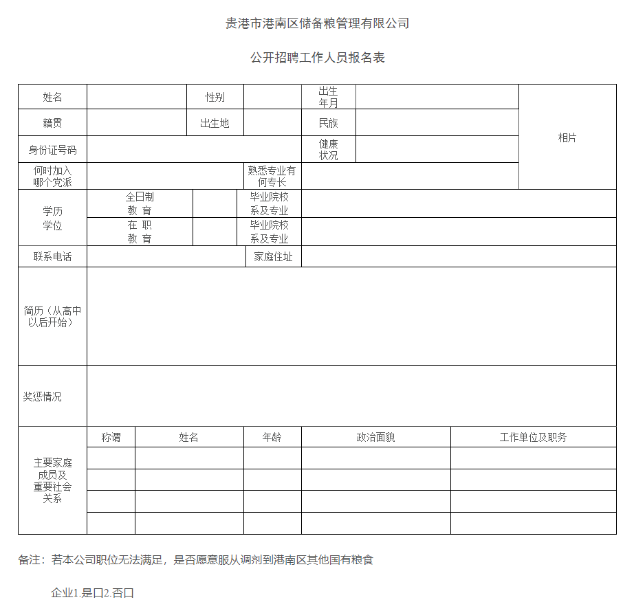 附件:貴港市港南區(qū)儲備糧管理有限公司公開招聘工作人員報(bào)名表