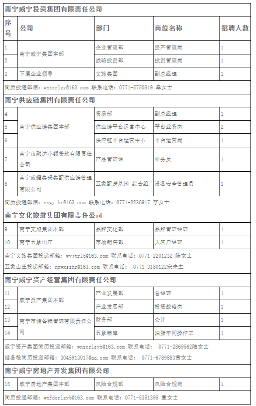 南寧威寧投資集團有限責任公司現因集團業(yè)務高速發(fā)展需要,集團本部及各下屬企業(yè)誠邀各類優(yōu)秀人才加盟,公司將提供完善的激勵晉升機制及廣闊的發(fā)展空間。熱忱歡迎有志之士加盟,公司將為您提供完善的激勵晉升機制及廣闊的發(fā)展平臺,招聘崗位、人數及崗位要求詳見附件。