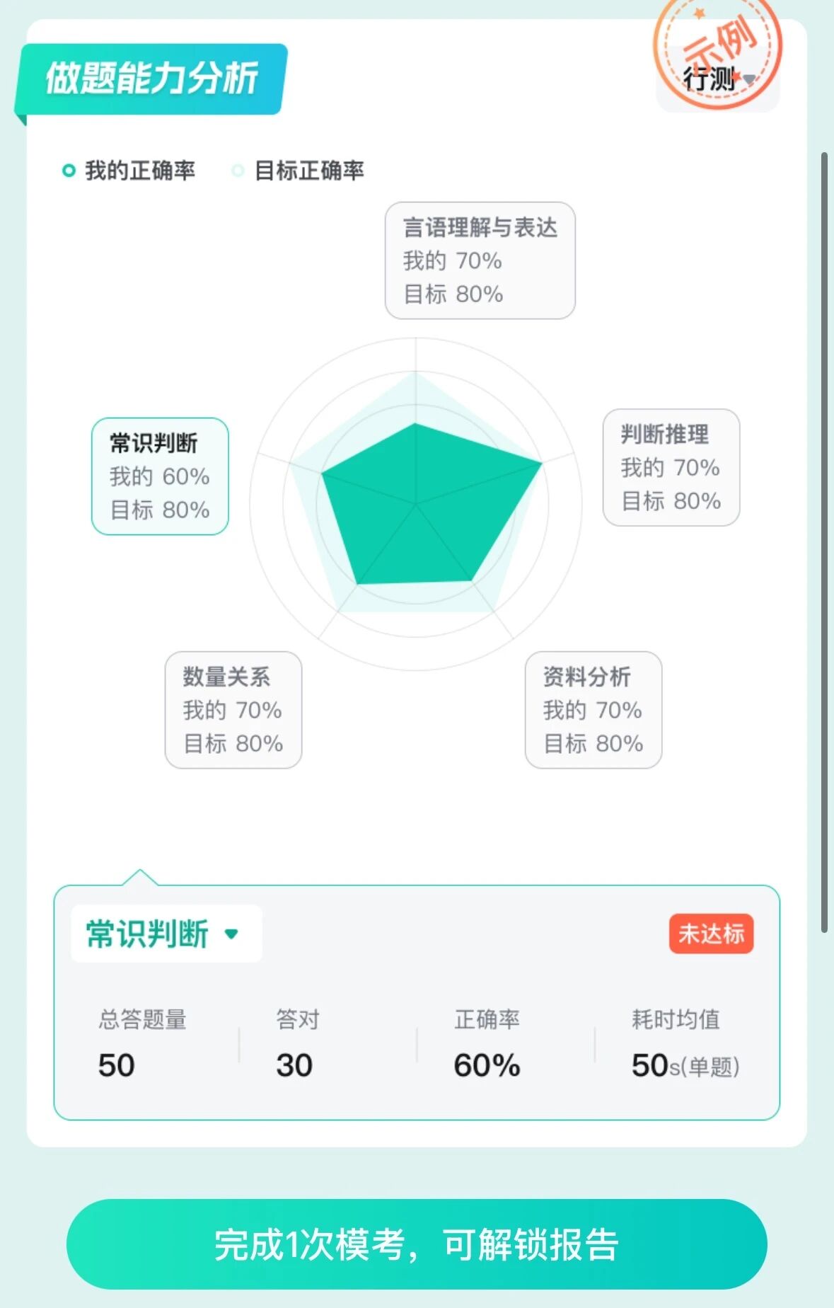 3??生成個人??紙蟾妫?/span>考完就能查看??汲煽?、排名及解析,生成的個人模考報告包含各模塊正確率分布、做題能力分析、筆試分數(shù)yu測等內(nèi)容。